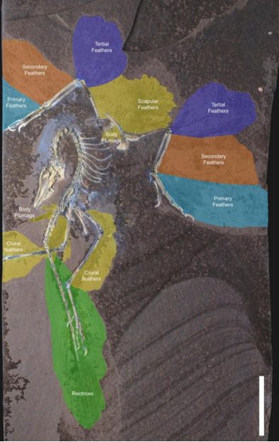 与此同时,芝加哥标本是首件发现三级飞羽的始祖鸟标本。这种附着在肱骨和尺骨上的羽毛位于翅膀和身体之间,可能在飞行过程中协助维持连续的空气动力学平面,从而实现和提高飞行效率。这一结构在非鸟恐龙中从未出现,显示这些羽毛可能是为了适应主动飞行而演化出的创新特征。